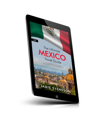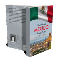 “Aerial view of a city with domed buildings; a Mexican flag waves above.”
