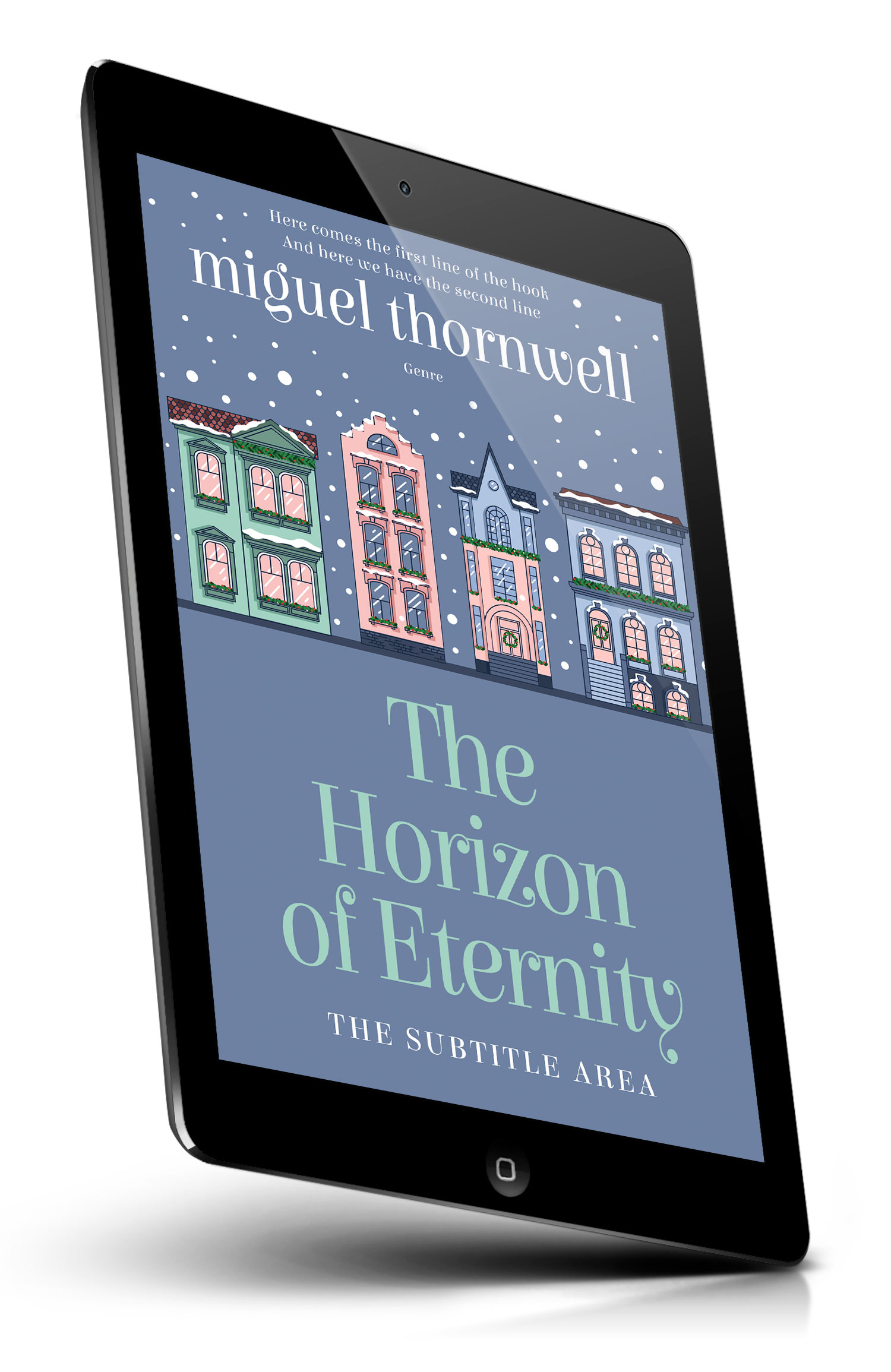 Tags: snowfall, winter, townhouses, city street, row houses, pastel colors, blue background, festive wreaths, window boxes, holiday decor, architecture, illustration, cozy, quaint, snowflakes, night sky, european street, urban winter, decorative facades, seasonal atmosphere, premade cover, book cover design, self-publishing, ebook cover, print ready
