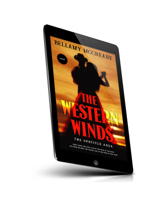 “A silhouetted couple dances against an orange sunset, with a cowboy hat and a flowing dress. The title "The Western Winds" dominates.”