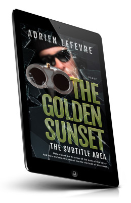 “A person wearing sunglasses aims a double-barrel shotgun. The background appears shattered and the title "The Golden Sunset" stands out.”