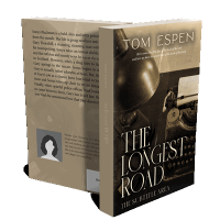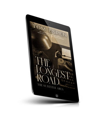 “A vintage typewriter and lamp in sepia tones with overlayed text about a book.”