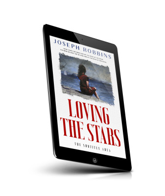 “A woman sits on a rock, gazing at a starry sky, with waves crashing below. The title "LOVING THE STARS" is prominently displayed.”