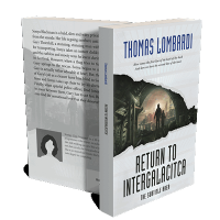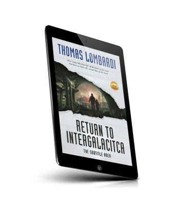 “A futuristic tunnel with two figures walking towards a cityscape. Sci-fi book cover with a gold badge.”