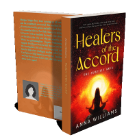 “A person is sitting cross-legged, meditating in front of a glowing, fiery background. The book title "Healers of the Accord" is displayed.”
