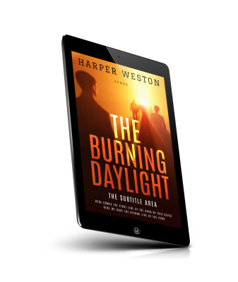 “Silhouettes walking into a bright, orange sunlight with the title "The Burning Daylight" in bold lettering.”