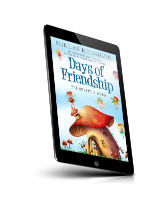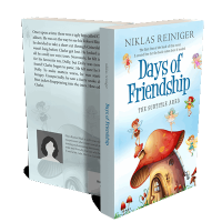 “Illustrated cover of a book titled "Days of Friendship" featuring fairies around a large mushroom house.”