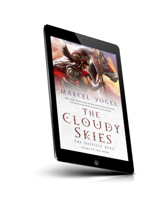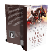 “A warrior in ornate armor, holding a spear, rides a horse under dramatic skies. Book title is prominent below the image.”