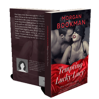 “A man whispers into a blindfolded woman's ear. She wears red lipstick and a black bra.”