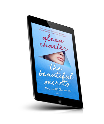 “A woman's face peeks through a triangular cutout against a blue background with elegant, cursive text.”