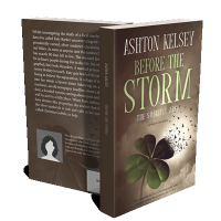 “A four-leaf clover with birds flying out of it against a stormy sky with large text above.”