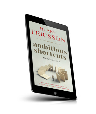 “A person stands in front of a spiraling domino sequence about to fall, symbolizing the concept of ambitious shortcuts.”