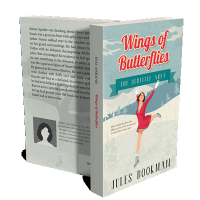 “A woman in a red dress ice skating with mountains in the background. The title "Wings of Butterflies" is at the top.”