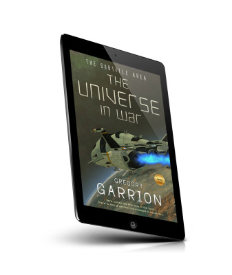“A sci-fi book cover features a spaceship emitting blue thrusters, flying over a planet.”