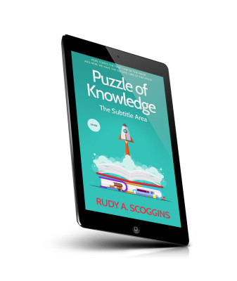 “Book cover with a rocket launching from an open book, surrounded by clouds and stacked books below. Teal background.”