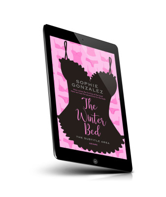 “A silhouette of a frilly slip dress against a pink lingerie-patterned background.”