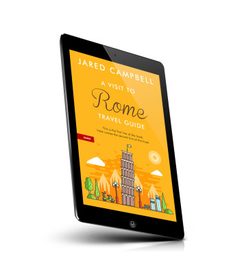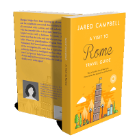 “A bright cover with an illustrated leaning tower, trees, buildings, and a scooter. The background is yellow-orange with a few clouds.”
