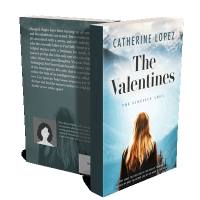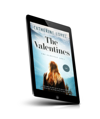 “A person with long hair stands facing mountains, under a cloudy sky. The image has a book cover layout with a genre circle.”