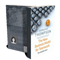 “Cover with silver spheres and one gold sphere, featuring the title "The New Business Model for Teamwork" by Dorothy Thompson.”