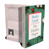 “A book cover design on a festive green background with red ornaments and ribbons.”
