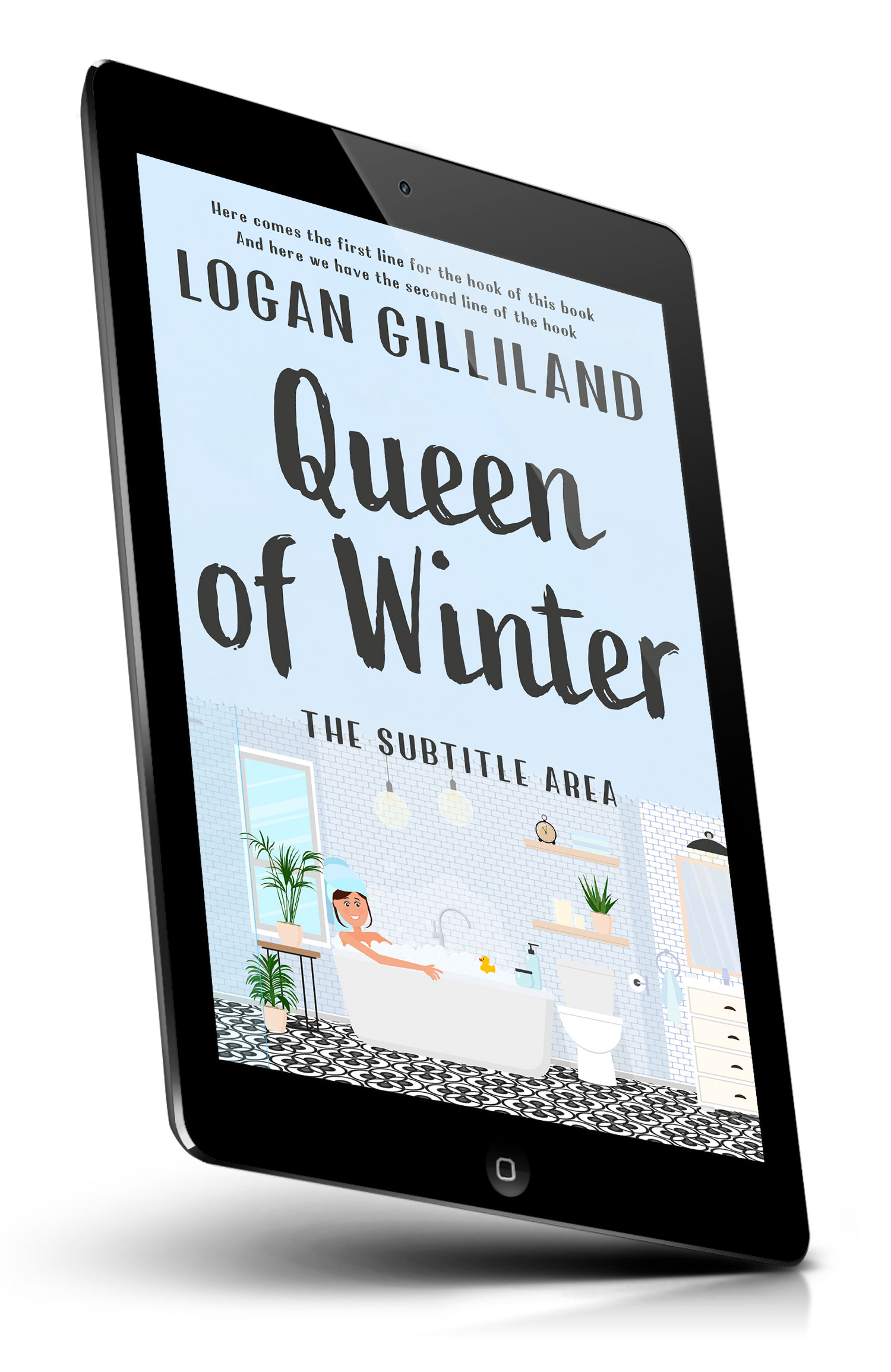 “Illustrated book cover showing a person relaxing in a bathtub in a bright tiled bathroom with plants, shelves, and a patterned floor.”