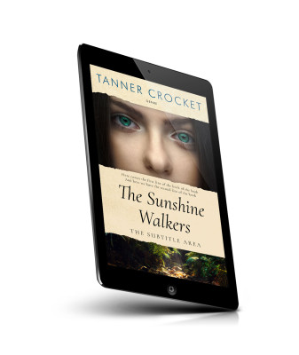 “Close-up of a woman's face with green eyes on a book cover with forest imagery at the bottom.”