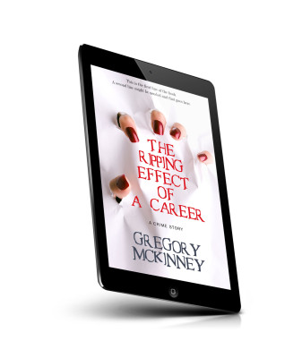 “A hand bursts through paper, showing red nails. The design suggests a crime story theme.”