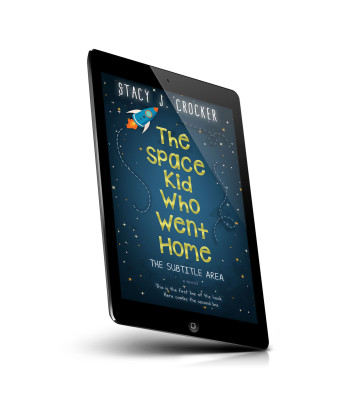 “A rocket and stars surround bold yellow text on a dark blue background with whimsical design elements.”
