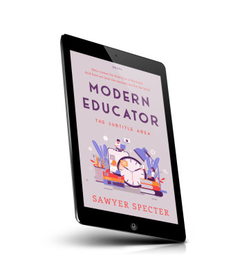 “Illustrated cover with people engaging in educational activities around a large clock, books, and school supplies.”