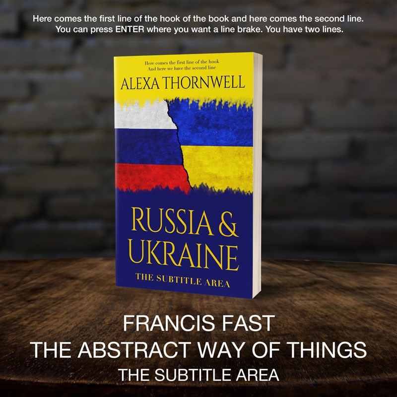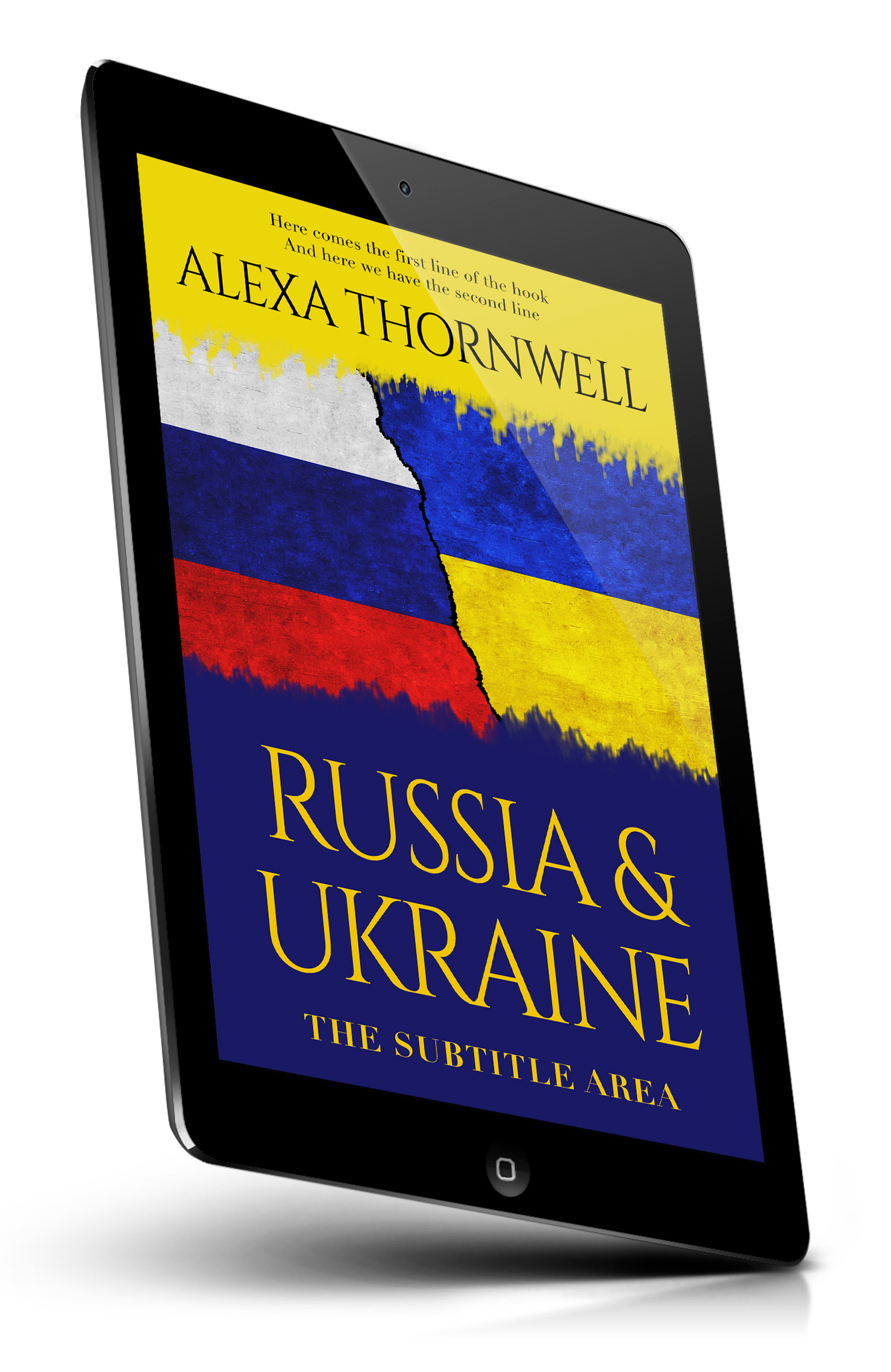 Tags: flags, russia, ukraine, torn border, crack, division, conflict, geopolitics, diplomacy, war, tension, national colors, blue yellow, red white, grunge texture, painted surface, distressed design, split composition, political theme, international relations, premade cover, book cover design, self-publishing, ebook cover, print ready