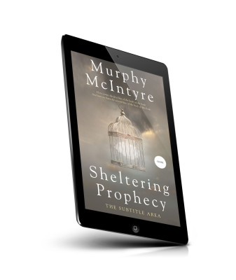 “An ornate birdcage floats in a cloudy sky on a book cover titled "Sheltering Prophecy" by Murphy McIntyre.”