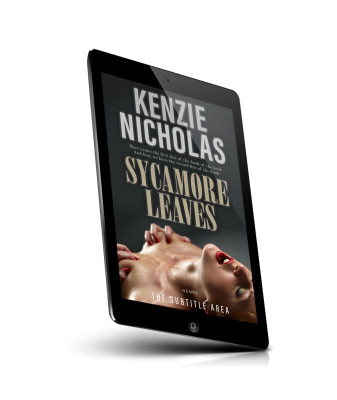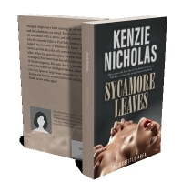 “A close-up of a person with red lipstick, hands on their chest, beneath the title "Sycamore Leaves" by Kenzie Nicholas. Dark background.”