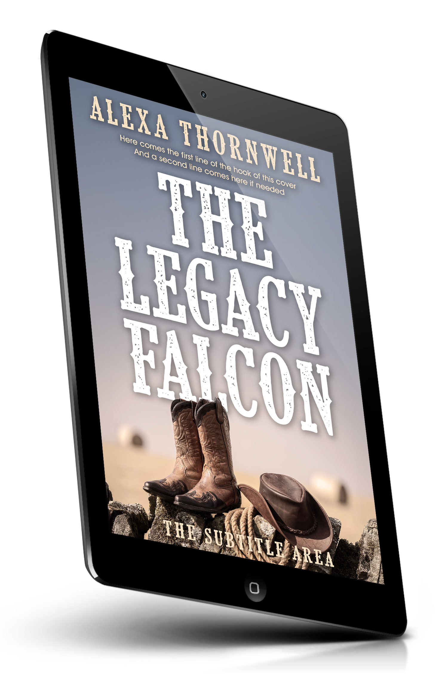 “Western-themed book cover with worn cowboy boots, a brown hat, and coiled rope on rocks against a hazy desert backdrop.”
