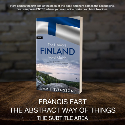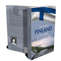 “Book cover featuring a Finnish flag, a scenic view of a lake and forests, and a title about a travel guide to Finland.”