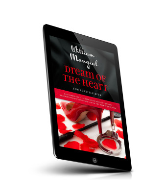 “A book cover featuring red high heels, handcuffs, a whip, and scattered rose petals against a dark background.”