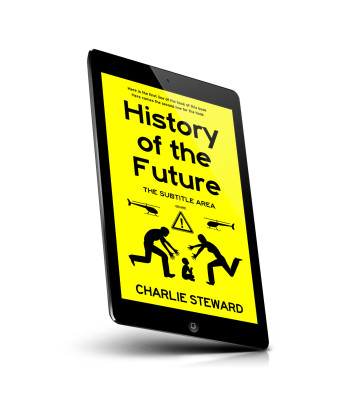 “Bright yellow book cover with bold black text, silhouettes of helicopters, two people, a child, and a caution sign.”