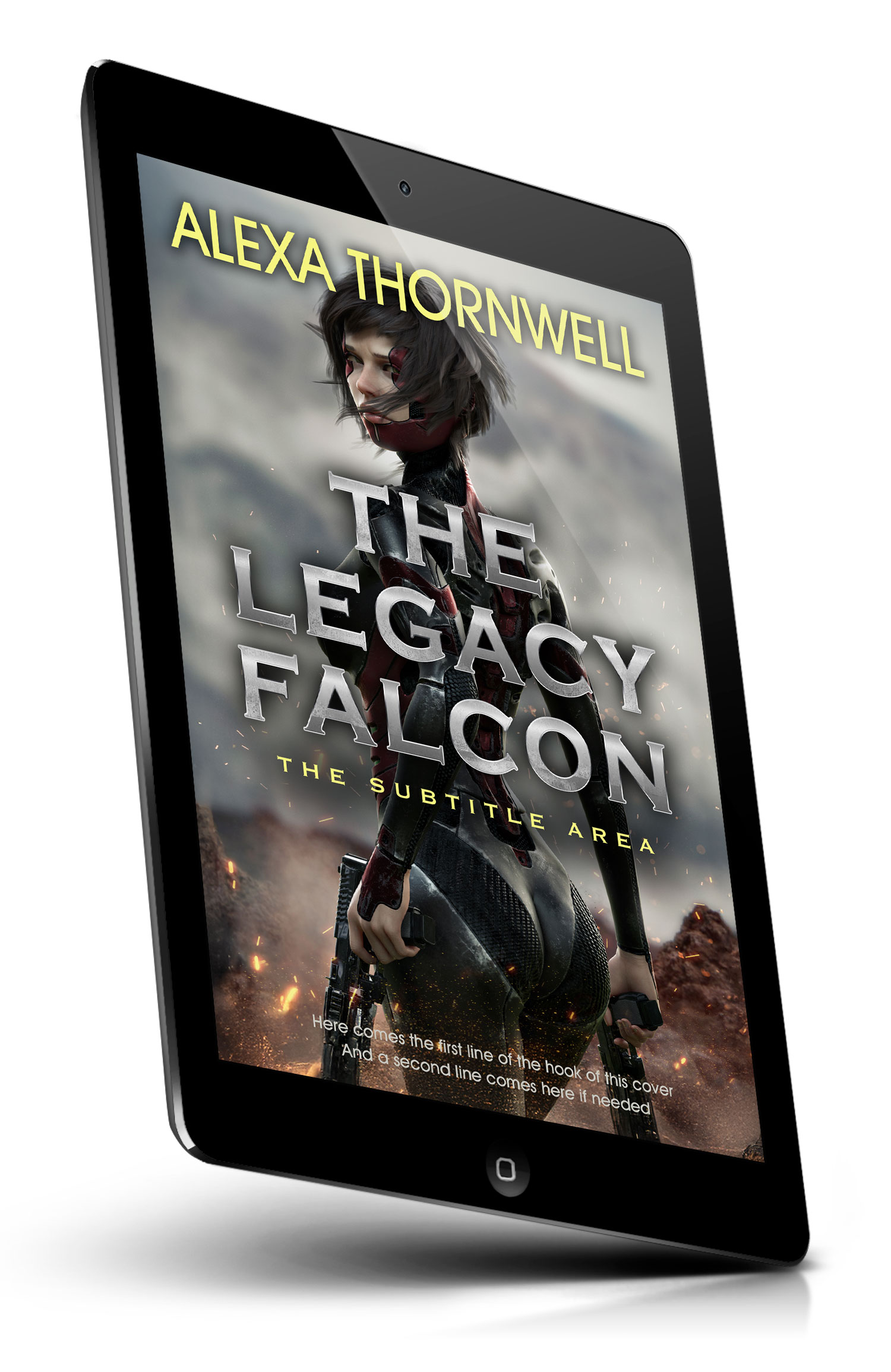 “A sci-fi book cover showing a woman in a futuristic suit holding two pistols, standing in a smoky, battle-scarred landscape.”
