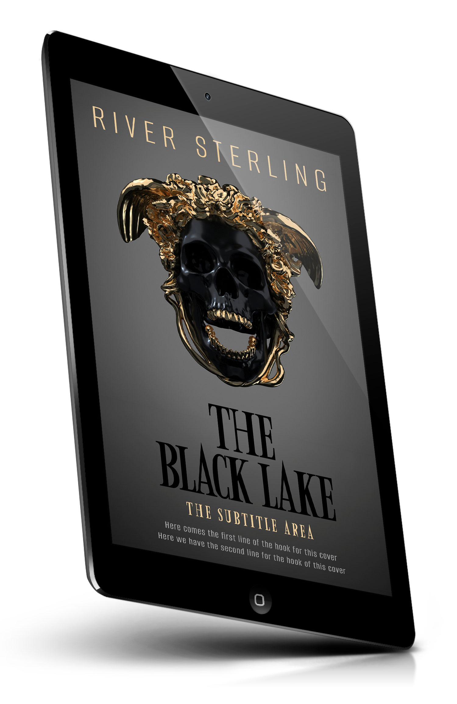 “A glossy black skull framed by swirling gold metallic shapes, centered on a dark gray background like a dramatic book cover.”