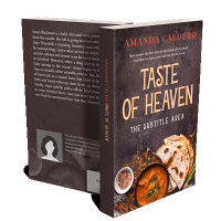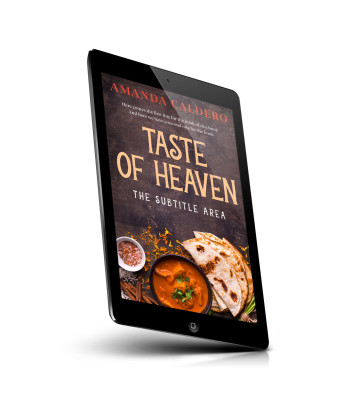 “A bowl of curry, naan bread, and spices on a dark wooden surface, with the book title "Taste of Heaven" at the top.”