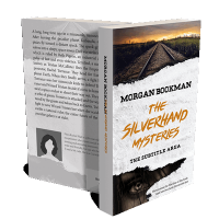 “A railway track at sunset, torn paper effect revealing part of a woman's face and text about a mystery novel.”