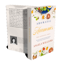 “An overhead view of a salad with various vegetables scattered on a white background and a book titled "Aromatic Harmonies" by Angela Williams.”