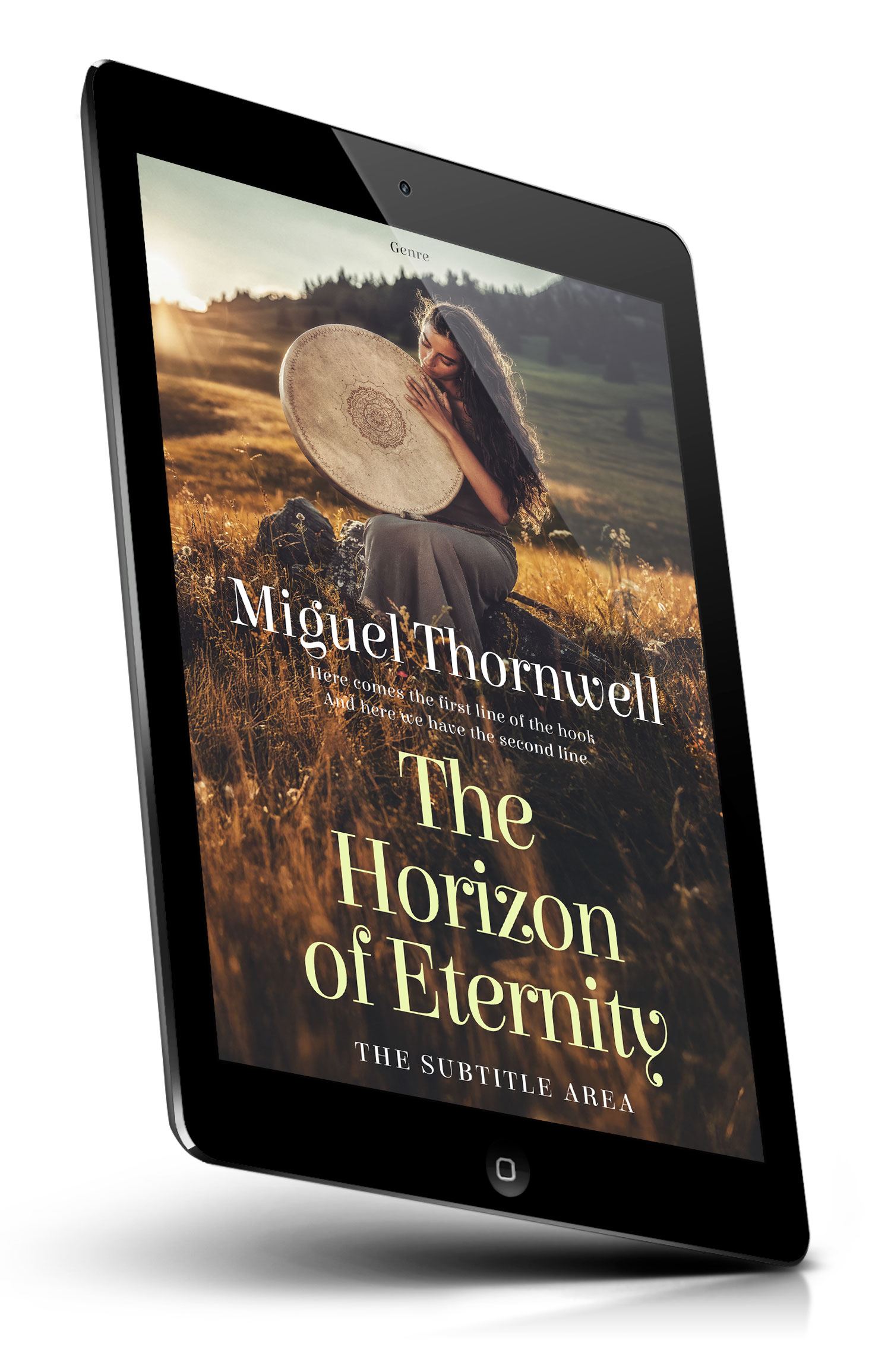 Tags: woman, musician, drum, frame drum, shamanic, meditation, serenity, nature, meadow, tall grass, mountains, sunset, golden light, wilderness, bohemian, long hair, acoustic, folklore, spiritual, pastoral scene, premade cover, book cover design, self-publishing, ebook cover, print ready