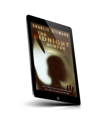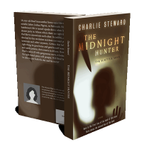 “A shadowy figure stands behind frosted glass, a knife raised ominously. The title "The Midnight Hunter" is prominently displayed.”