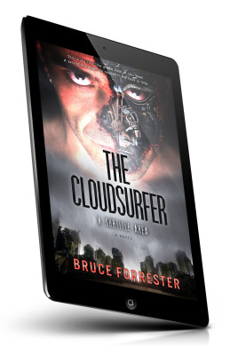 “A futuristic figure with a partially robotic face looms above a cityscape. The design suggests a science fiction theme.”
