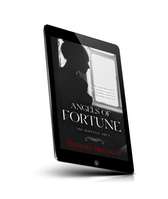 “A silhouette of a woman facing a window, with text overlay promoting "Angels of Fortune" by Rowan Spencer.”