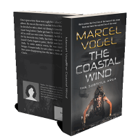 “A woman in aviator gear, crawling forward, with a dark, stormy background. The text above highlights the title and author.”