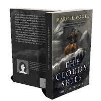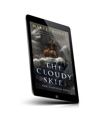 “A rugged warrior stands with a bear under a dramatic sky. The book cover has a dark, mystical theme.”