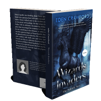 “A dark, mystical scene with a black winged horse in a foggy forest. Book cover for "Wizards Invaders" by Eden Crawford.”