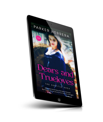 “A woman in a blue dress stands in front of a rustic background, with the book title "Dears and Trueloves" prominently displayed.”