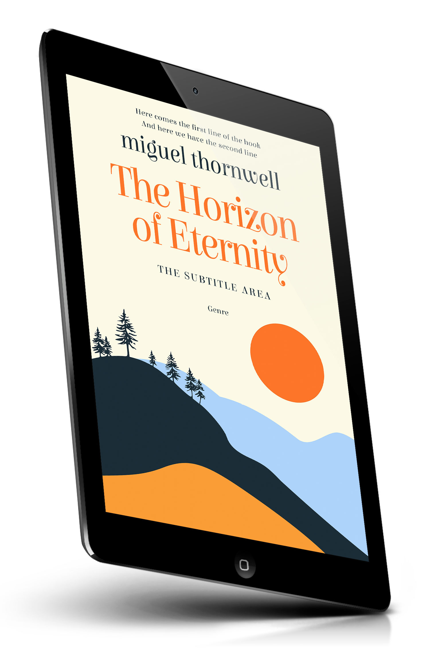 Tags: minimalist, landscape, sunset, sun, mountains, hills, pine trees, forest silhouette, rolling hills, horizon, nature, outdoors, scenic view, abstract shapes, flat design, modern cover, pastel colors, orange accent, serene, typography design, premade cover, book cover design, self-publishing, ebook cover, print ready