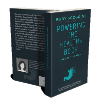 “A book cover with the title "Powering the Healthy Body" by Rudy Scoggins, featuring a minimalist design with teal text on a dark background.”